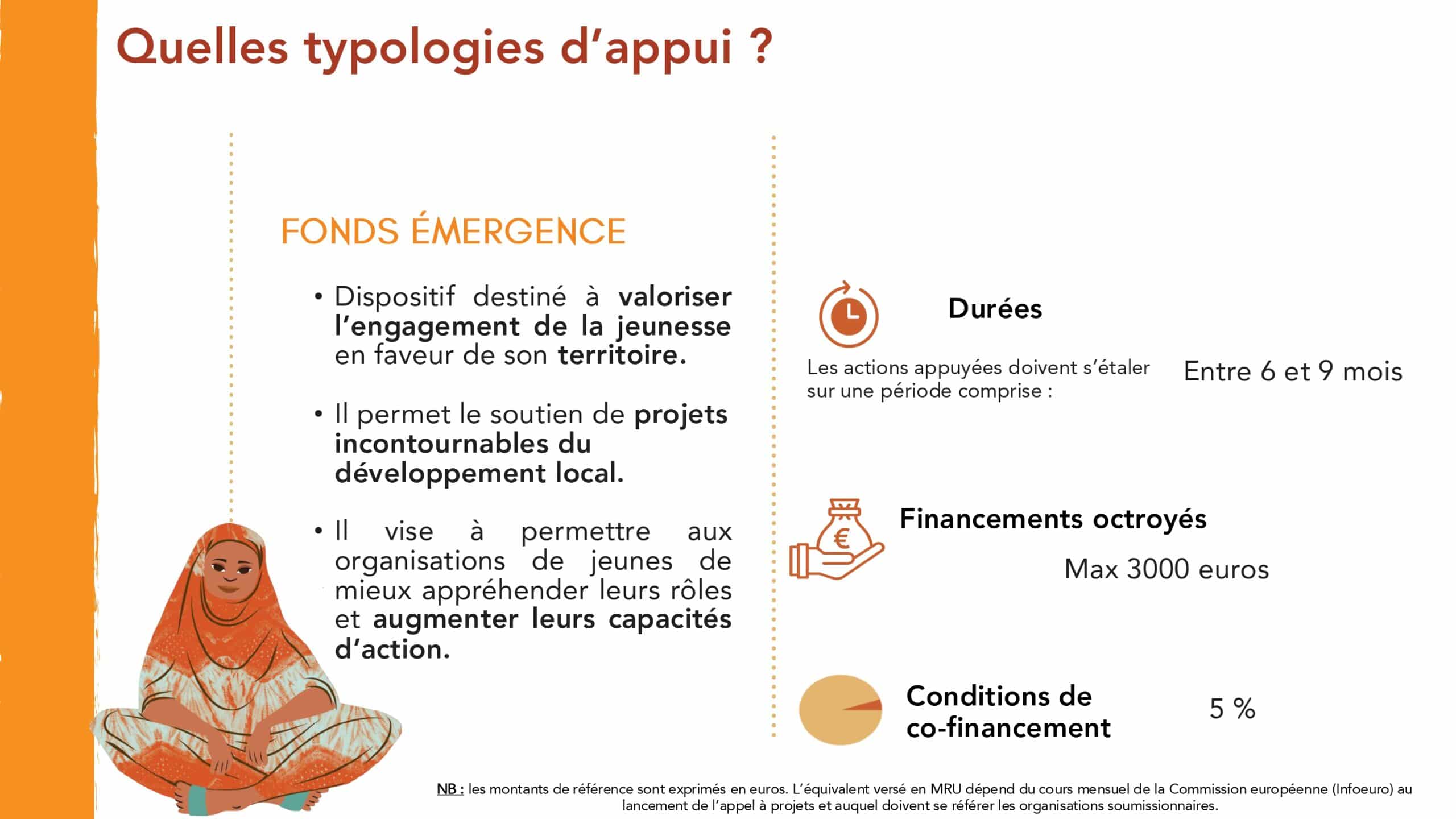 – Le Fonds « Emergence » valorise l’engagement de la jeunesse dans son territoire en soutenant des initiatives de développement local portées par des organisations de jeunes dont la capacité d’absorption est limitée. Ce dispositif leur permet de mieux appréhender leurs rôles et d’augmenter leurs capacités d’action. Le montant du financement Graines de Citoyenneté peut varier de 1 000 € jusqu’à 3 000€. Un cofinancement de 5% du montant total du projet est nécessaire.