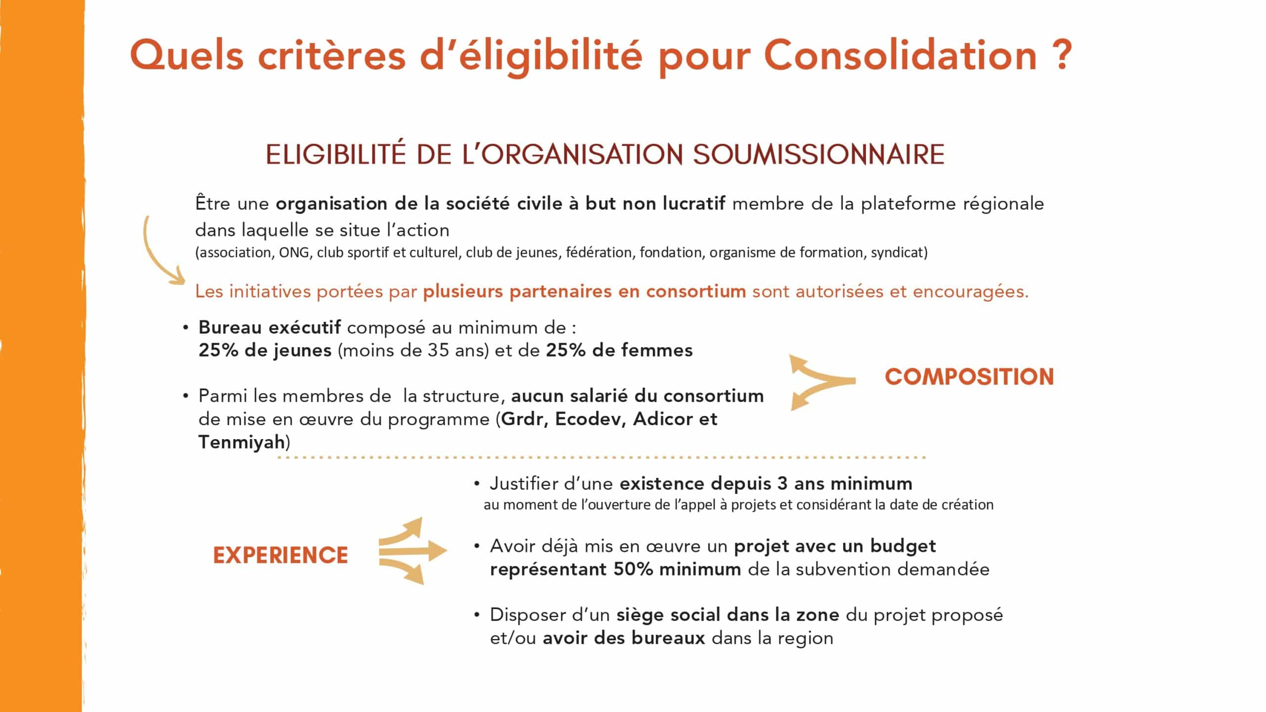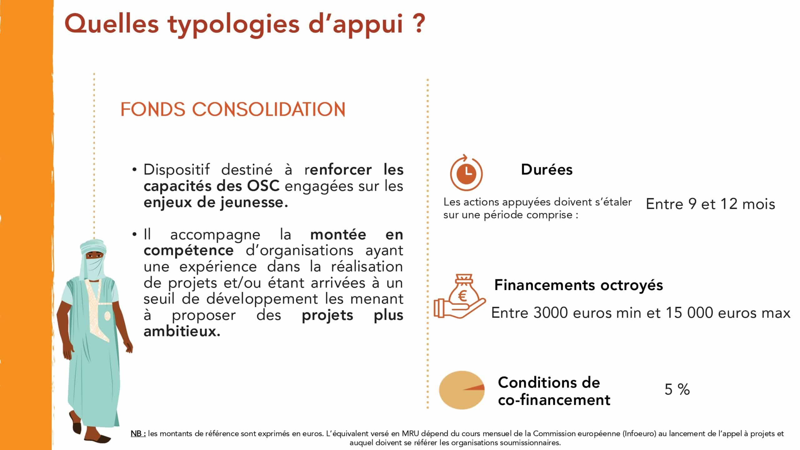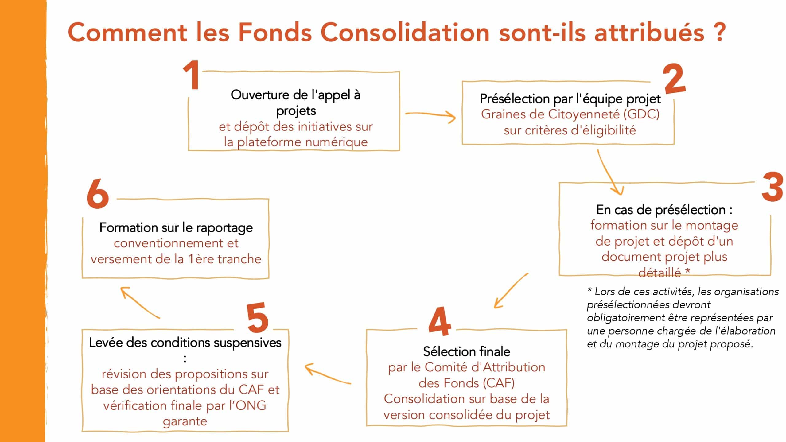 Le Fonds « Consolidation » est destiné à des organisations engagées sur les enjeux de la jeunesse ayant déjà un certain niveau d’expérience dans la réalisation et la gestion de projets. Il a pour objectif d’accompagner leur montée en compétence. Les organisations candidates peuvent proposer des projets pouvant être financés à hauteur de 3 000 € jusqu’à 15 000€ par Graines de Citoyenneté. Un cofinancement de 5% du montant total du projet est nécessaire. L’organisation soumissionnaire doit être membre d’une plateforme régionale de la société civile située dans le territoire d’intervention et avoir directement mis en œuvre un projet dont le budget représente au moins 50% de la subvention demandée. Les projets peuvent être portés en consortium.