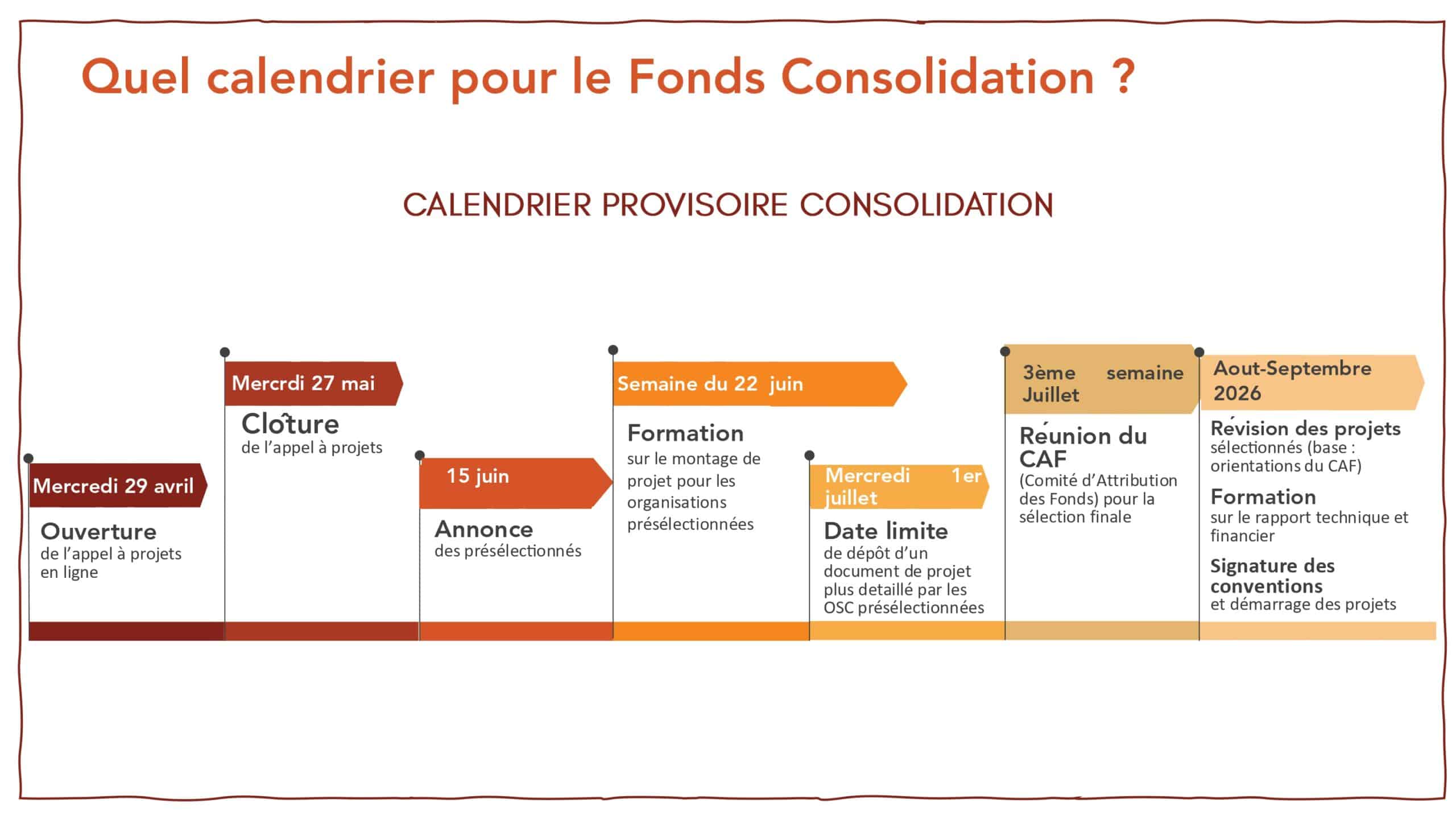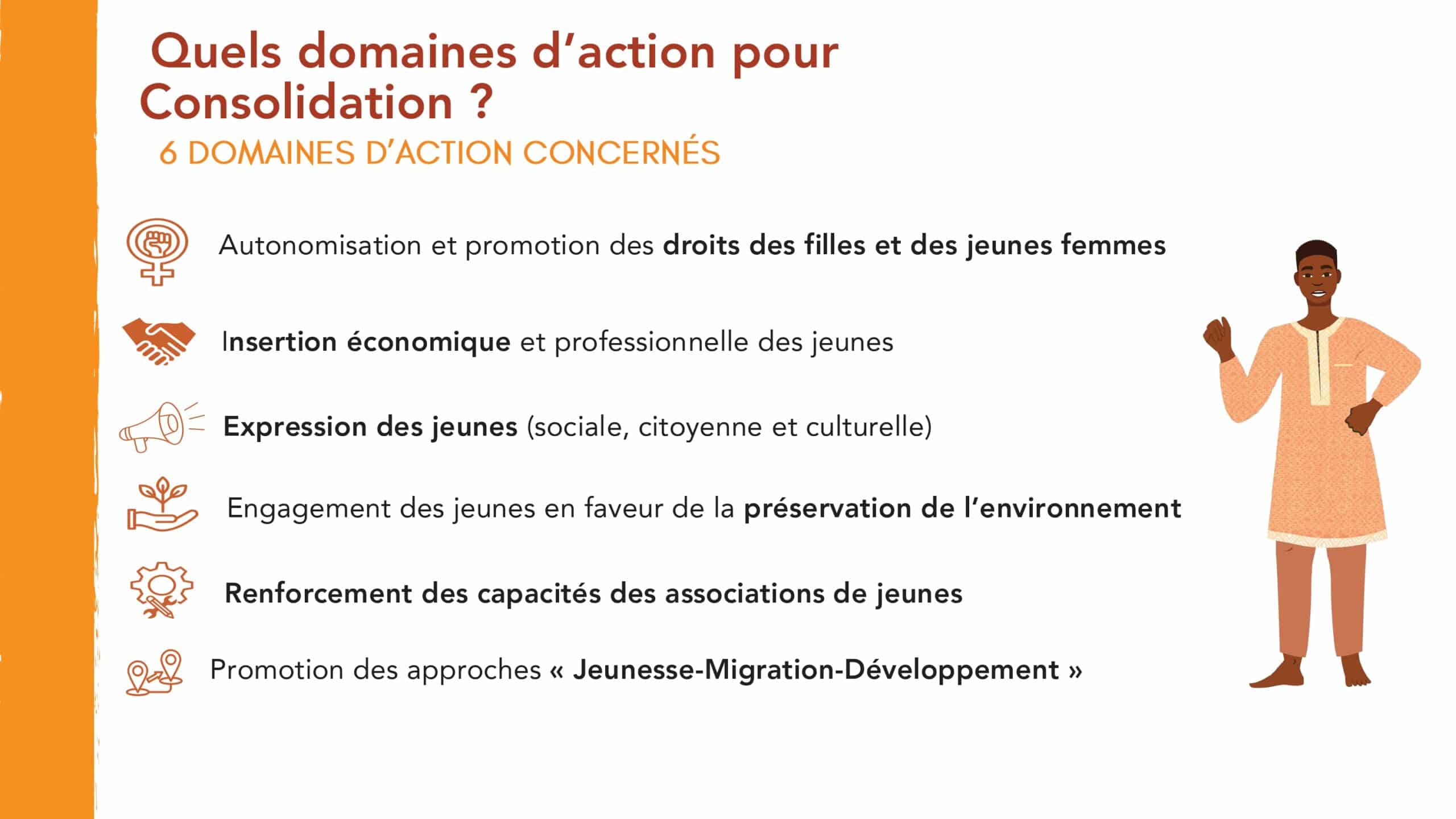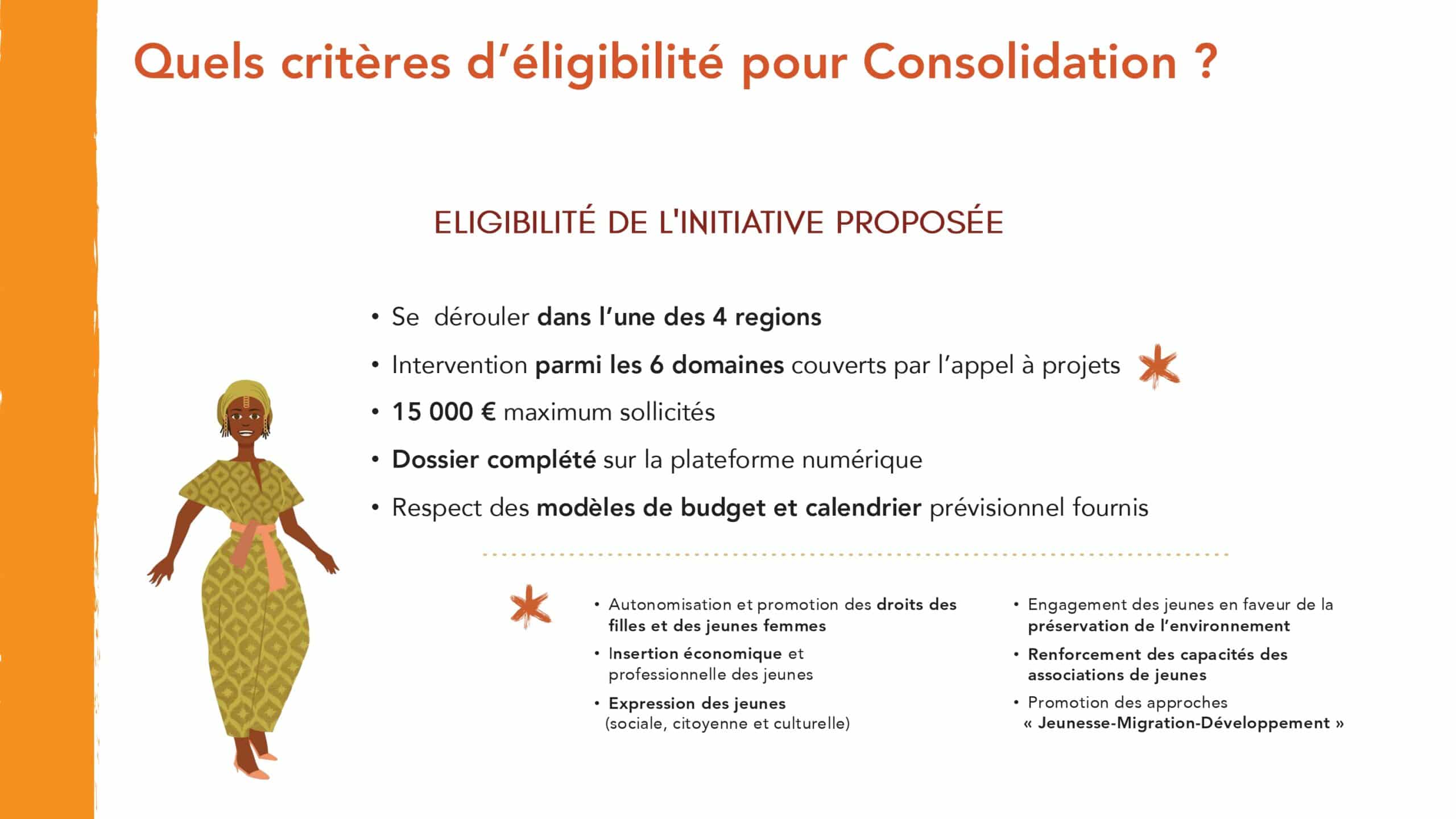 Le Fonds « Consolidation » est destiné à des organisations engagées sur les enjeux de la jeunesse ayant déjà un certain niveau d’expérience dans la réalisation et la gestion de projets. Il a pour objectif d’accompagner leur montée en compétence. Les organisations candidates peuvent proposer des projets pouvant être financés à hauteur de 3 000 € jusqu’à 15 000€ par Graines de Citoyenneté. Un cofinancement de 5% du montant total du projet est nécessaire. L’organisation soumissionnaire doit être membre d’une plateforme régionale de la société civile située dans le territoire d’intervention et avoir directement mis en œuvre un projet dont le budget représente au moins 50% de la subvention demandée. Les projets peuvent être portés en consortium.