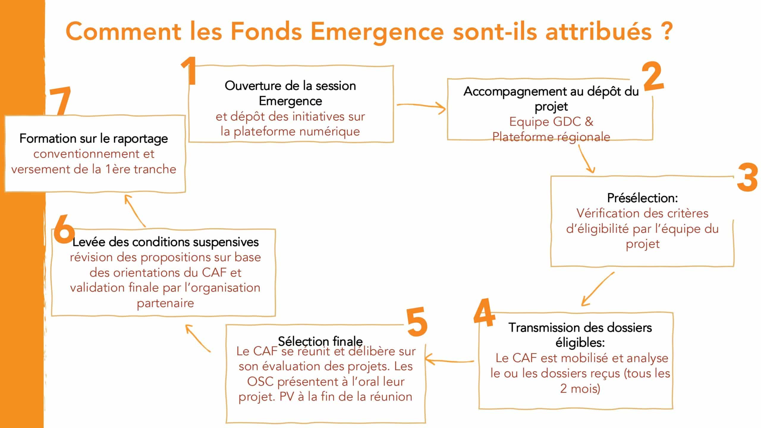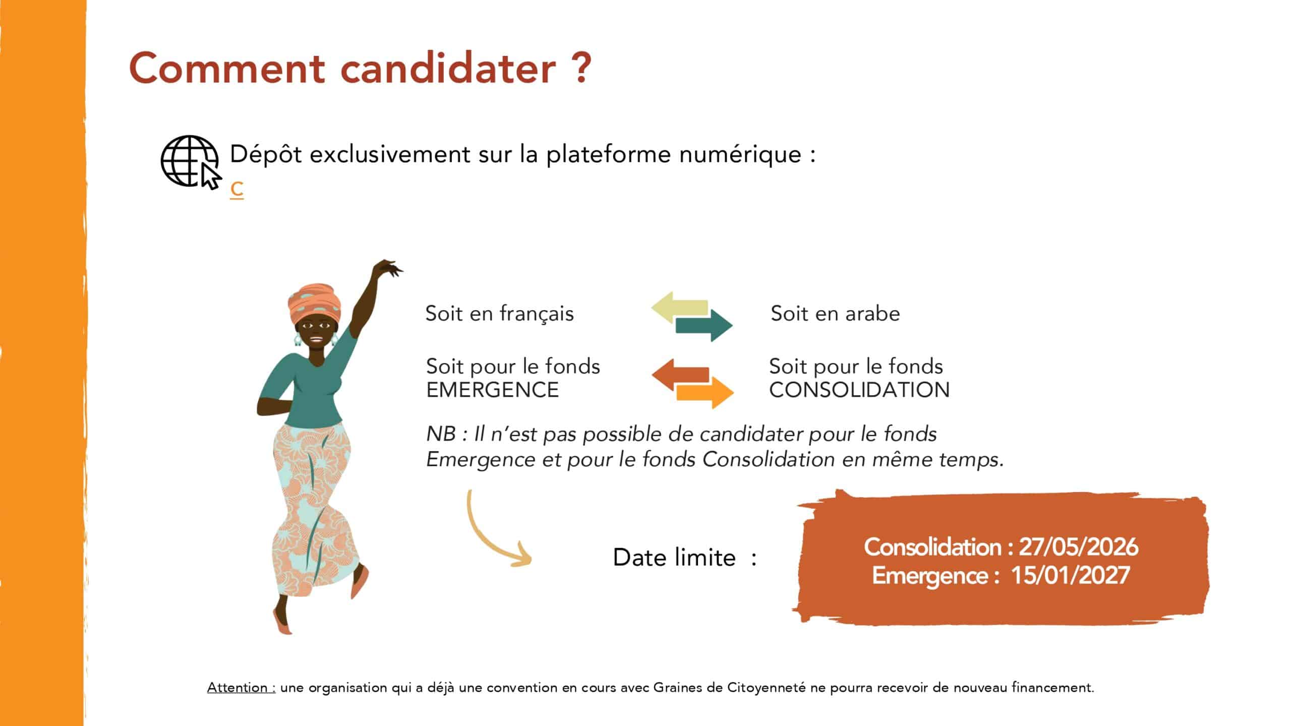 Toute organisation qui souhaite accéder au Fonds Émergence ou Consolidation doit obligatoirement soumissionner à travers la plateforme numérique dédiée au programme Graines de Citoyenneté : Connexion | Graines de citoyenneté (portailsolidaire.org)