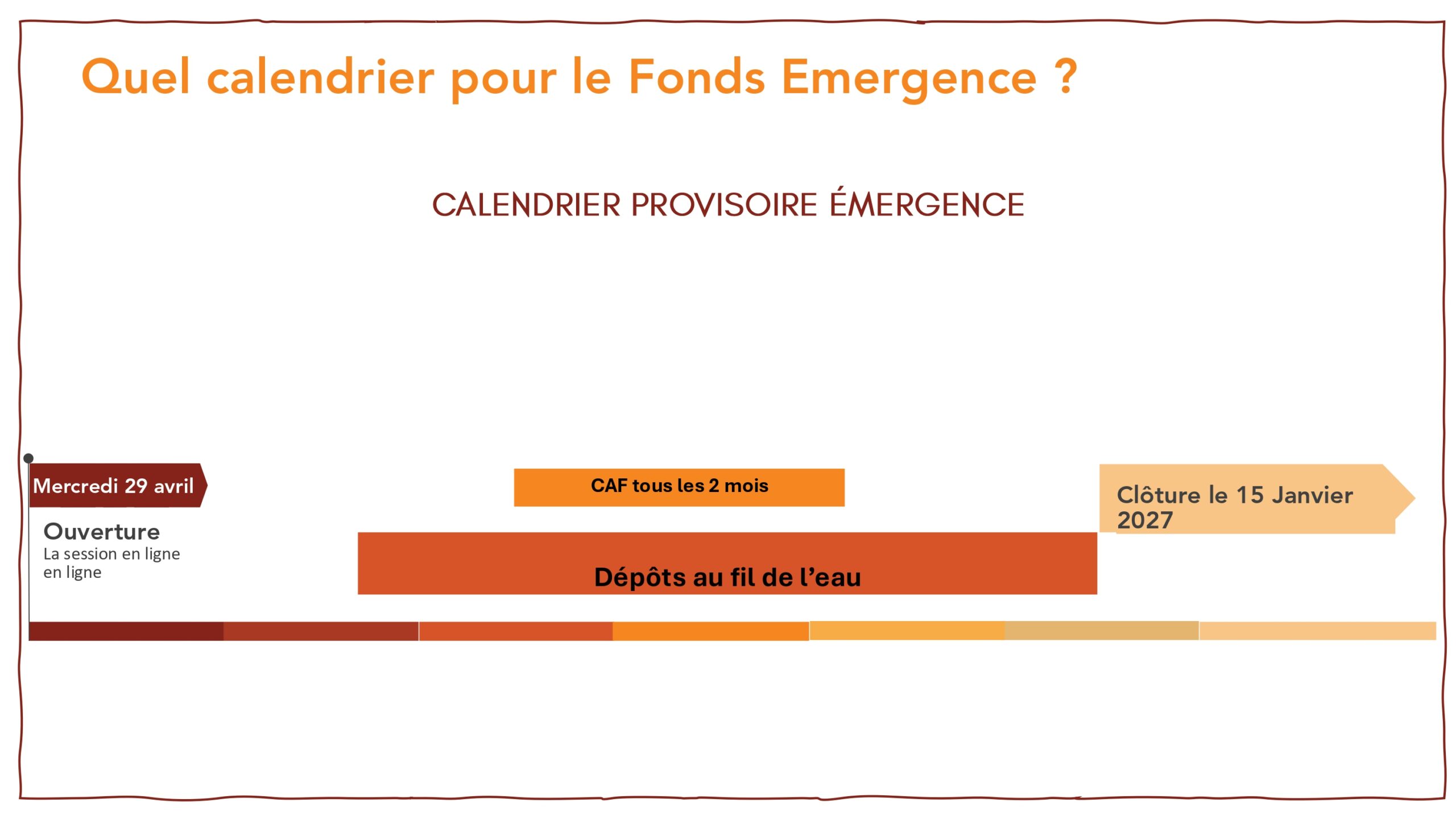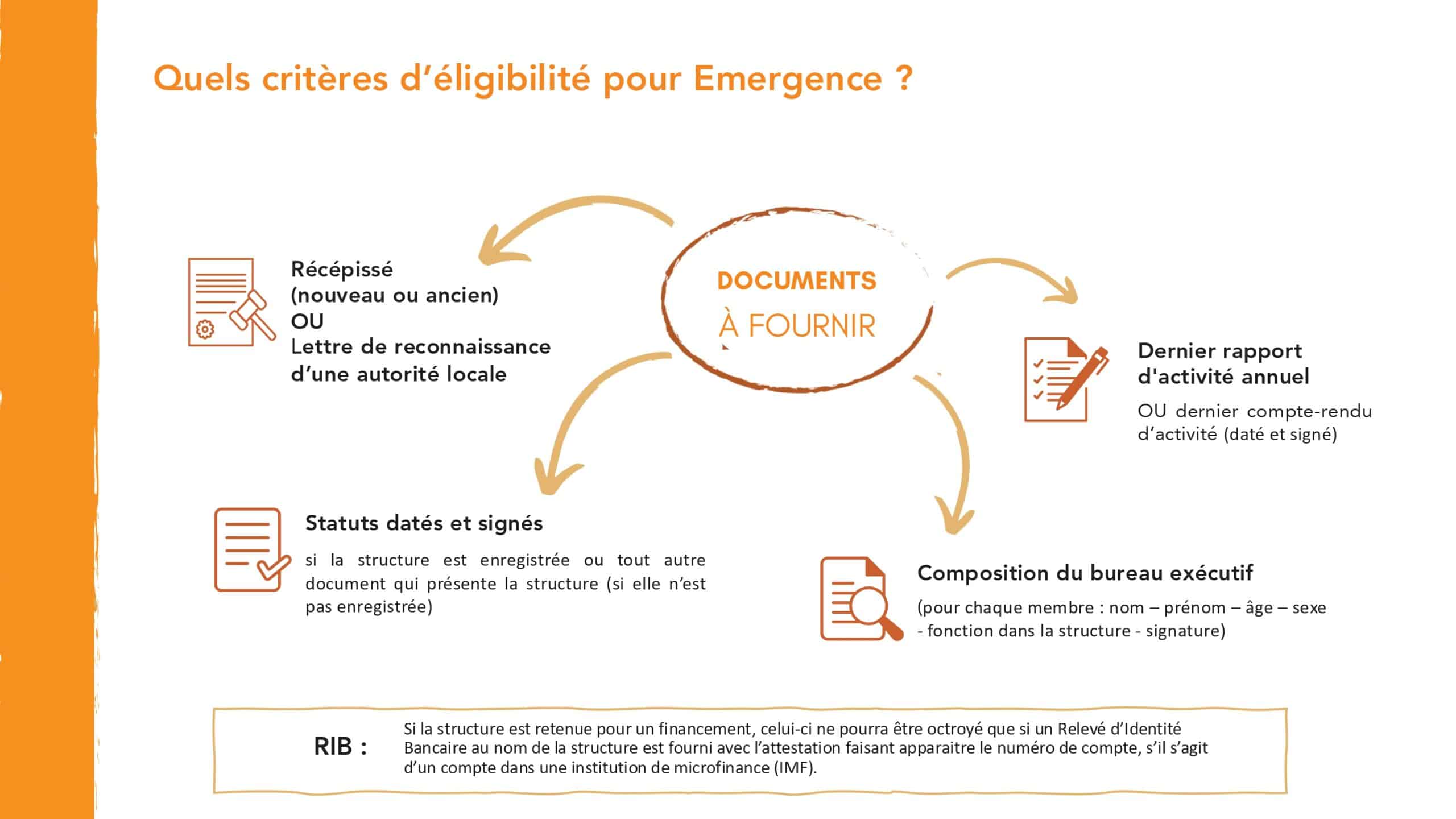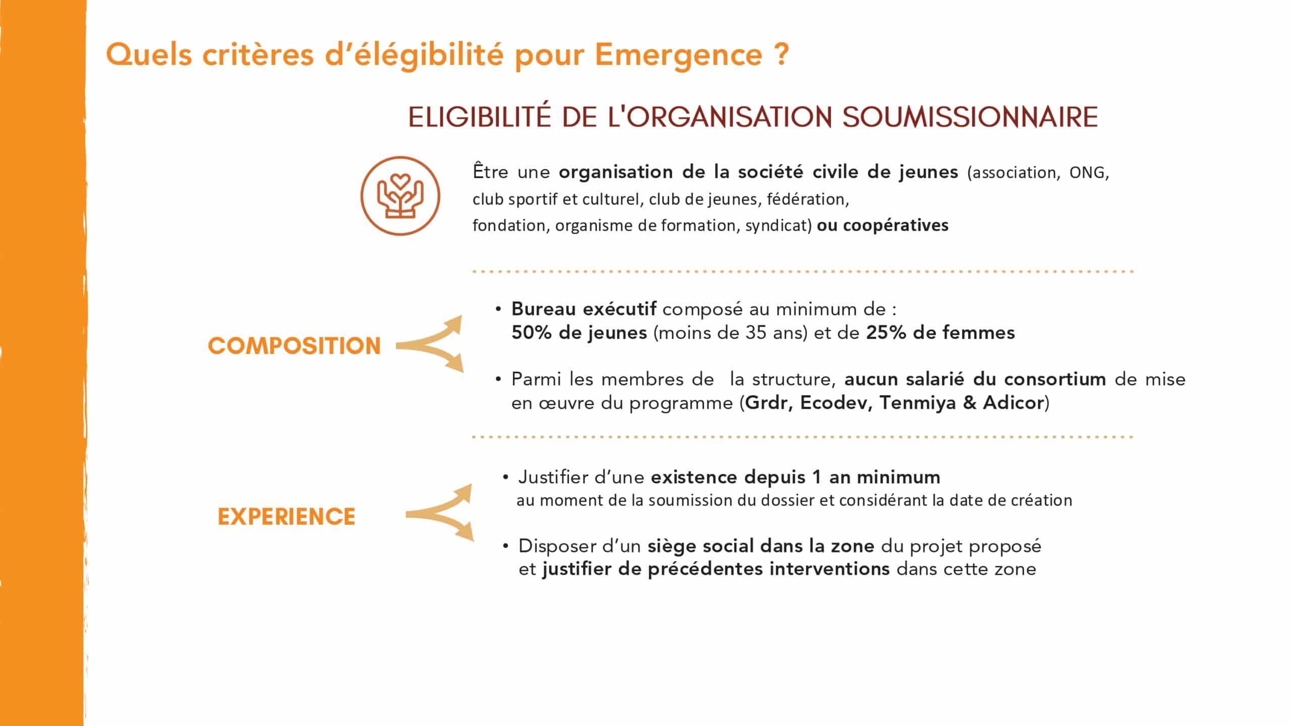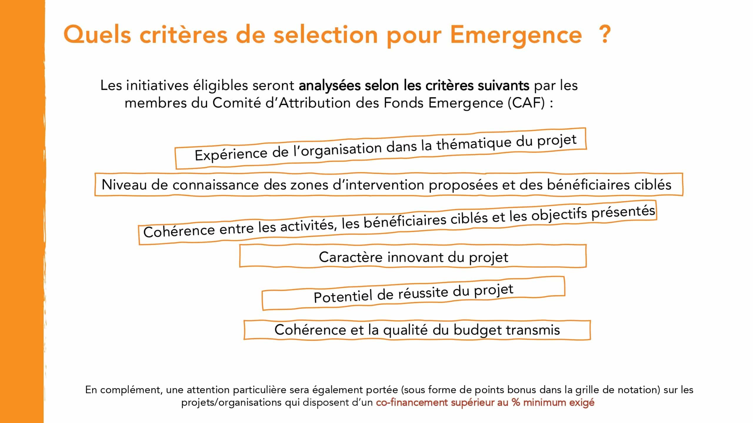 Attention : une organisation ne peut se positionner que sur un seul fonds d’appui à la fois ! Une structure qui soumet un dossier pour le Fonds « Émergence » ne pourra pas candidater en même temps sur le Fonds Consolidation, et inversement.