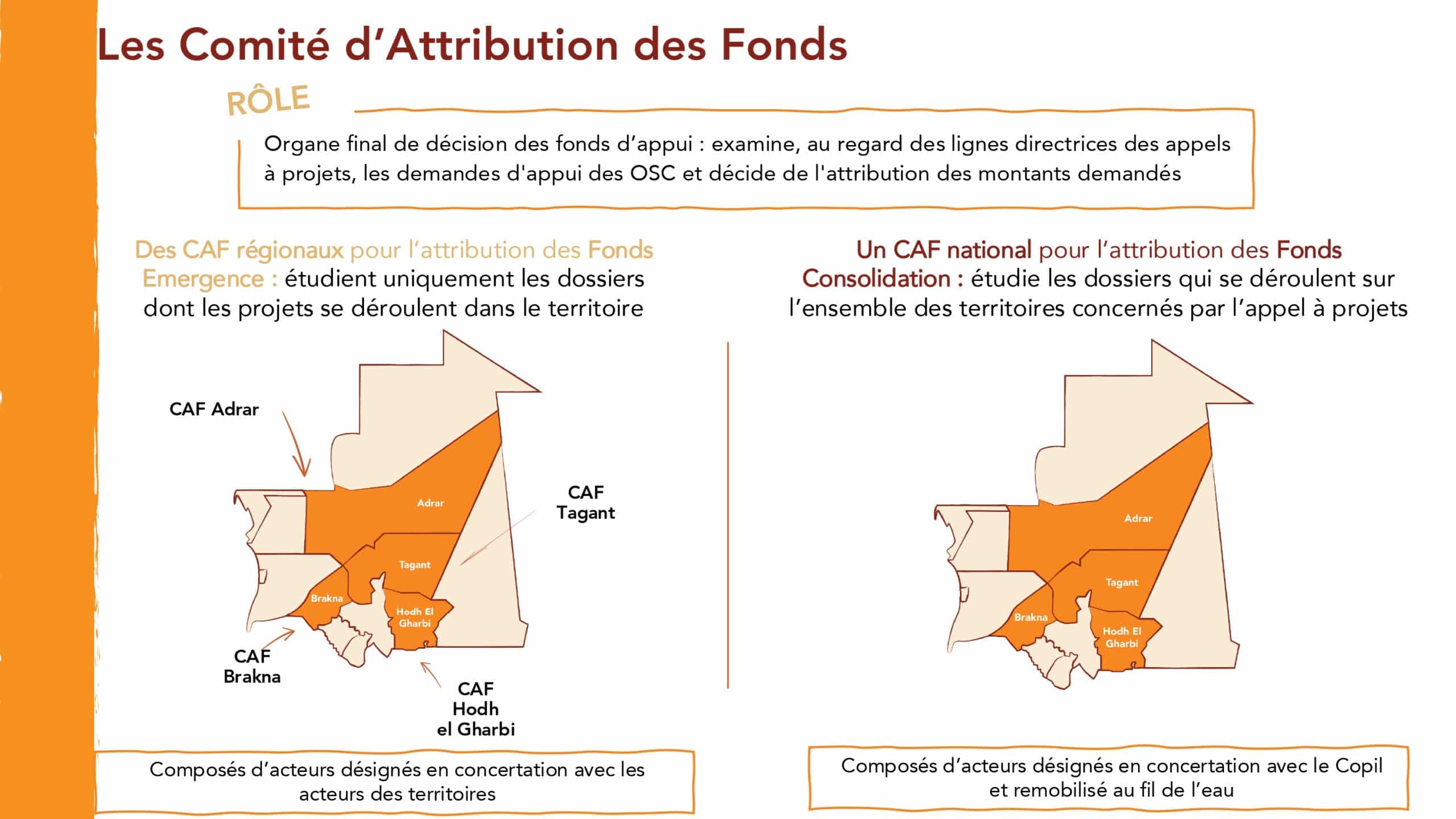 Ces fonds sont destinés aux organisations de la société civile de 4 régions mauritaniennes : Adrar, Brakna, Hodh El Gharbi et Tagant. Les modalités sont issues d’un processus de maturation du dispositif imaginé en concertation avec les acteurs des territoires d’intervention du programme.