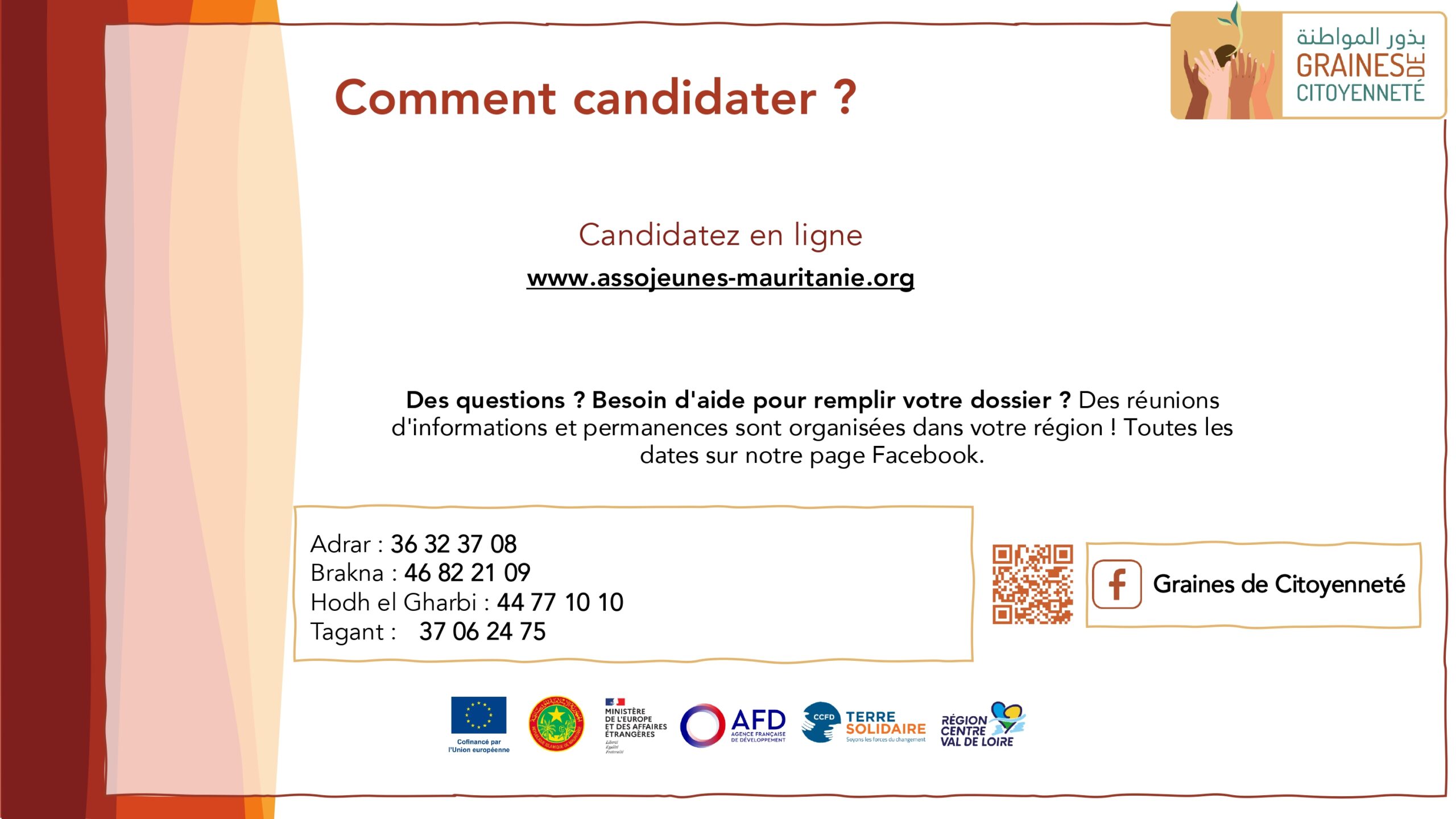 A partir du mercredi 29 avril 2026, Graines de Citoyenneté lance un nouveau dispositif d’appui pour vos projets ! Celui-ci s’adresse  aux organisations de jeunes ou engagées pour l’insertion de la jeunesse en Adrar, au Brakna, en Hodh el Gharbi et au Tagant (Mauritanie) à travers deux dispositifs : le guichet de subventions Émergence et l’appel à projets Consolidation.